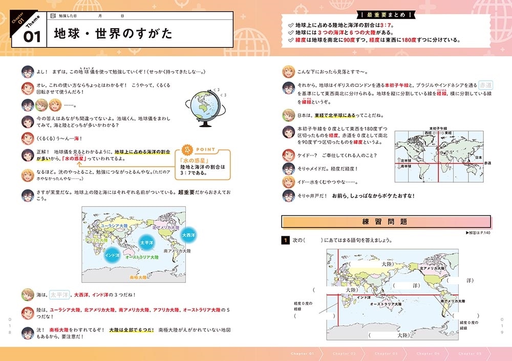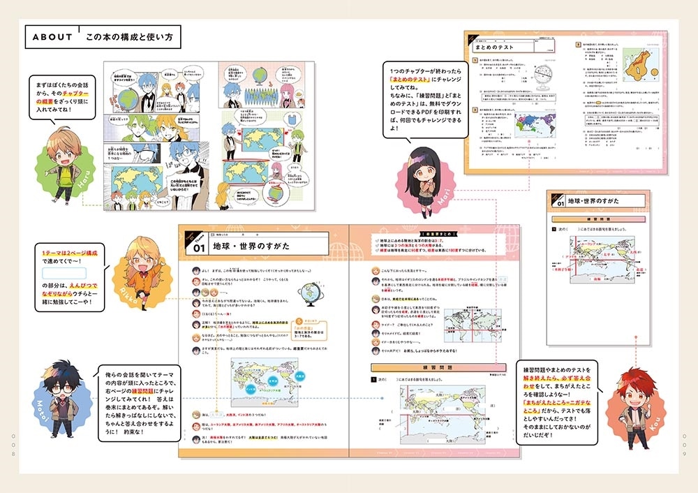 1、マンガで導入→ 2、キャラの会話でより深く理解 →3、練習問題で定着度チェックの3ステップ構成。