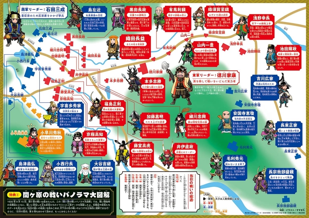 ・特典3【関ヶ原の戦いパノラマ大図解】 「関ヶ原の戦い」の東軍・西軍の布陣図や有力武将27名のプロフィール、当日の時間経過などを1枚のポスターに!