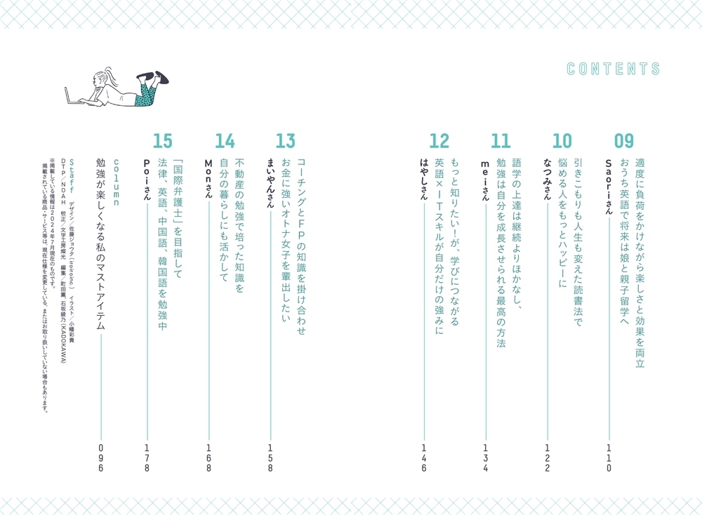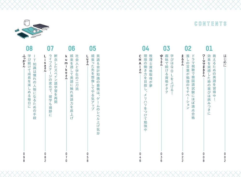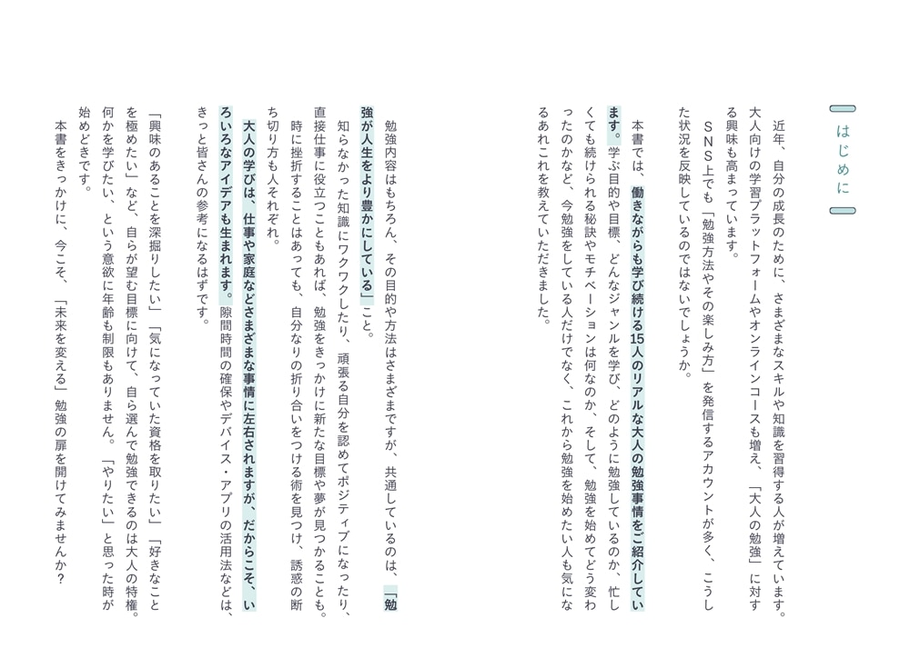 本書では、忙しくても、働いていても勉強を続ける15人の学ぶ目的や目標、勉強しているジャンルや勉強法、1日のスケジュール、忙しくても続けるための秘訣、モチベーションアップ術、勉強することで変わったことといった、大人だからこその勉強事情をリサーチ、リアルな実例をご紹介します。