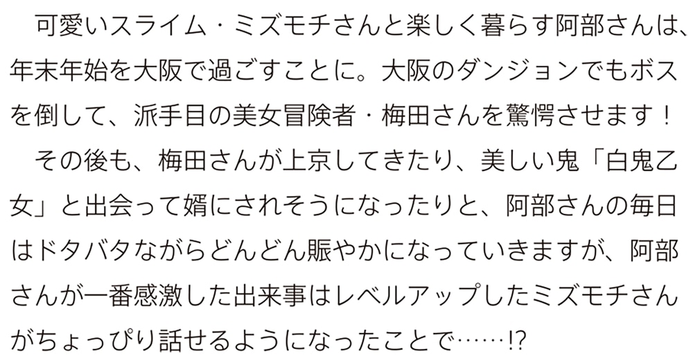 可愛いスライム・ミズモチさんと楽しく暮らす阿部さんは、年末年始を大阪で過ごすことに。大阪のダンジョンでもボスを倒して、派手目の美女冒険者・梅田さんを驚愕させます!