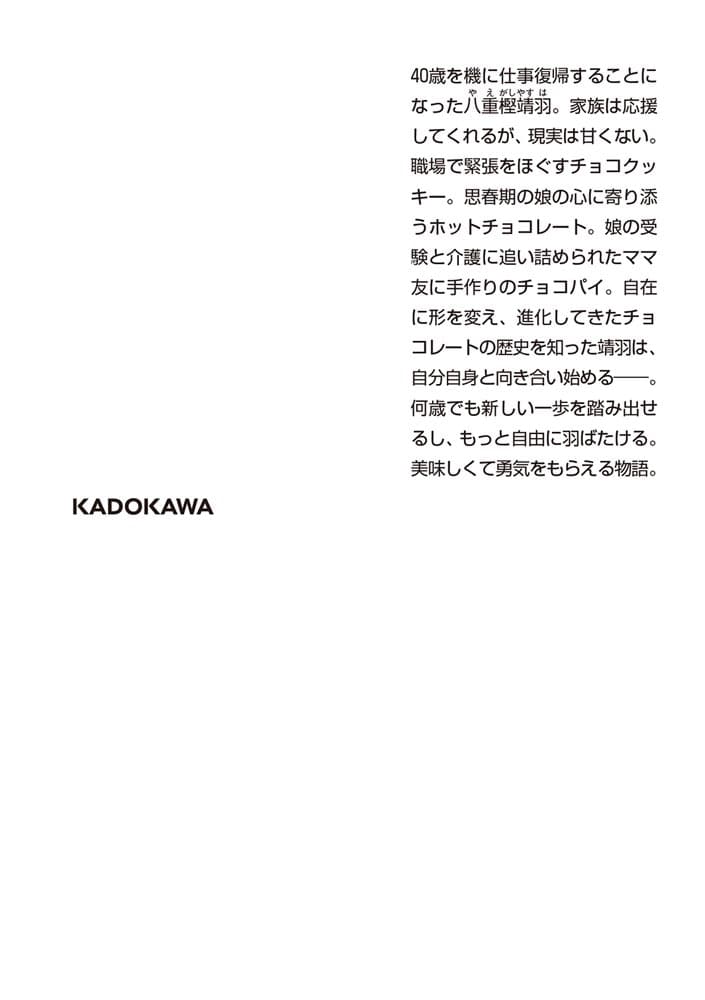 40歳を機に仕事復帰することになった八重樫靖羽。家族は応援してくれるが、現実は甘くない。職場で緊張をほぐすチョコクッキー。思春期の娘の心に寄り添うホットチョコレート。娘の受験と介護に追い詰められたママ友に手作りのチョコパイ。チョコレートは自由に形を変え、進化していったと知った靖羽は、自分自身と向き合い始める――。何歳からでも新しい一歩を踏み出せるし、もっと自由に羽ばたける。美味しくて勇気をもらえる物語。