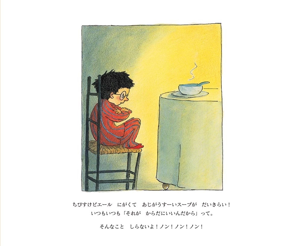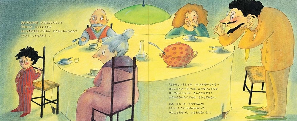 「好き嫌いをする子のところには、まじょコルヌがやってくるぞ!」とパパがおどかしますが、ピエールはどこふくかぜ。