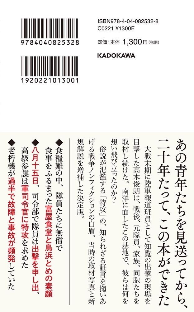 大戦末期に陸軍報道班員として知覧の出撃の現場を目撃した高木俊朗は、戦後、元隊員、親と子、同胞たちを取材し続けた。南洋に面したこの基地で、彼らは何を想い飛び立ったのか?俗説が氾濫する「特攻」の、知られざる証言を掬いあげる戦争ノンフィクションの白眉、当時の取材写真と新規解説を増補した決定版。