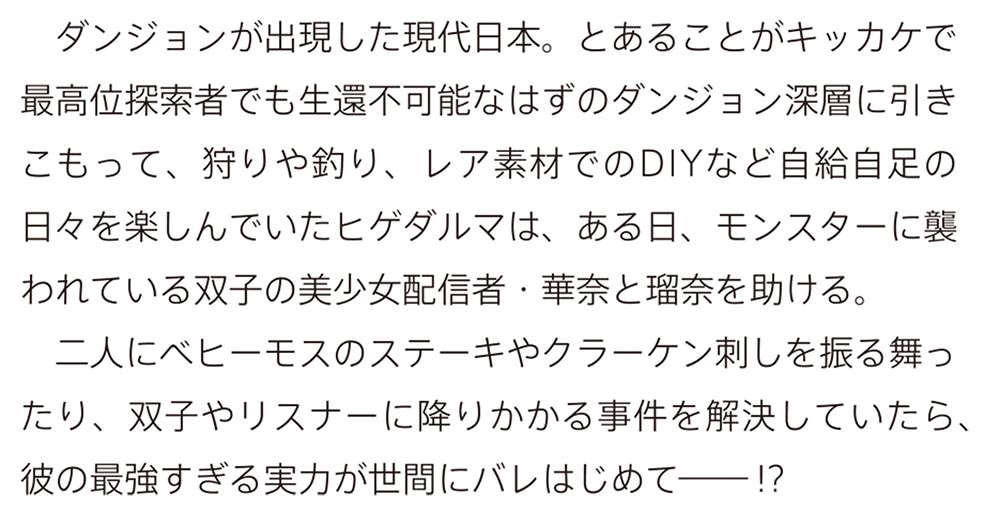ダンジョンが出現した現代日本。とあることがキッカケで最高位探索者でも生還不可能なはずのダンジョン深層に引きこもって、狩りや釣り、レア素材でのDIYなど自給自足の日々を楽しんでいたヒゲダルマは、ある日、モンスターに襲われている双子の美少女配信者・華奈と瑠奈を助ける。