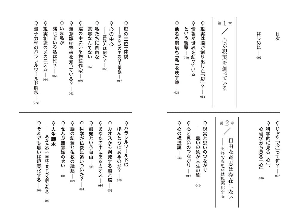 本書は、脳科学・心理学・量子力学・仏教、そして古今東西の様々な哲学からたどり着いた真実、「現実はすべて心が生み出している」こと、そして私たちを動かしているのは、意識や意志ではなく、「無意識」だということをひもときます。