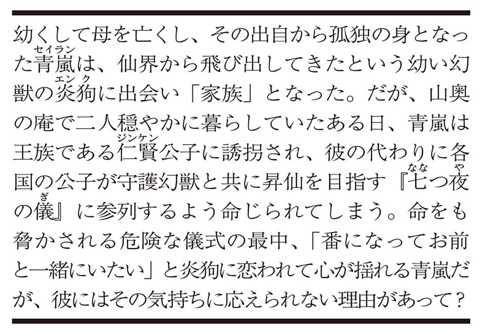 幼くして母を亡くし、その出自から孤独の身となった青嵐は、仙界から逃げてきたという幼い幻獣の炎狗に拾われ「家族」となった。だが、山奥の庵で二人穏やかに暮らしていたある日、青嵐は王族である仁賢公子に誘拐され、彼の代わりに各国の公子が守護幻獣とともに昇仙を競う『七つ夜の儀』に参加するよう命じられてしまう。命をも脅かされる危険な儀式の最中、「番になってお前と一緒にいたい」と炎狗に恋われて心が揺れる青嵐だが、青嵐にはその気持ちに応えられない理由があって?