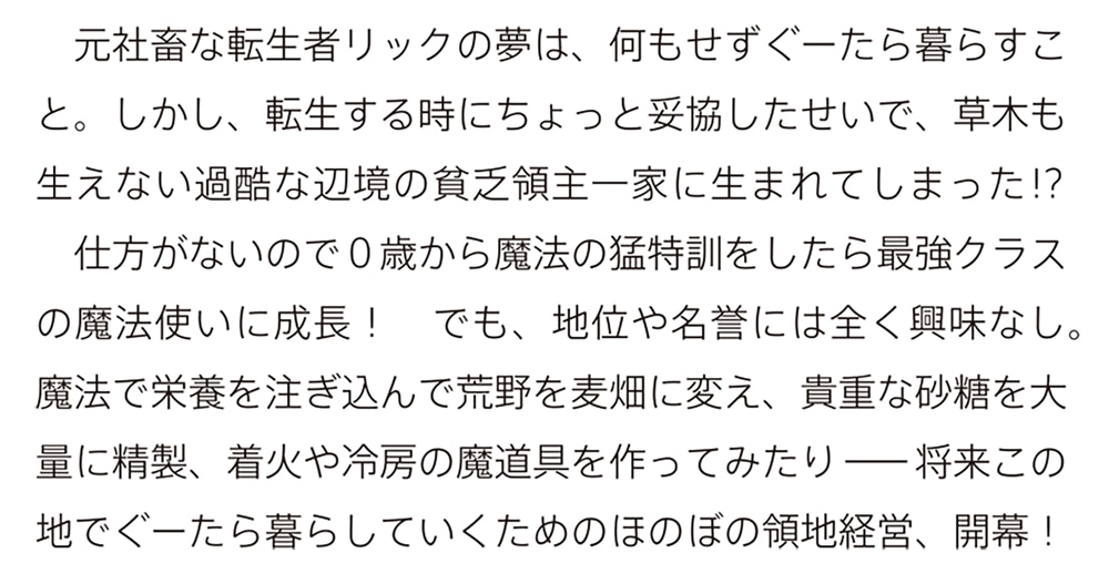 元社畜な転生者リックの夢は、何もせずぐーたら暮らすこと。しかし、転生する時にちょっと妥協したせいで、草木も生えない過酷な辺境の貧乏領主一家に生まれてしまった!?