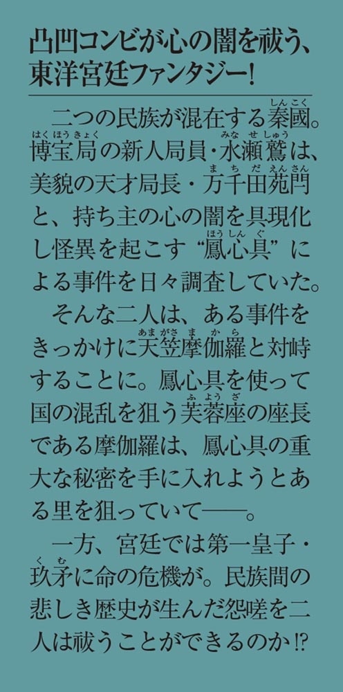 博宝局の新人局員・水瀬鷲は、美貌の天才局長・万千田苑閂と、持ち主の心の闇を具現化し怪異を起こす“鳳心具”による事件を日々調査していた。