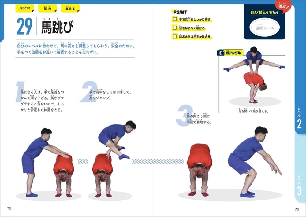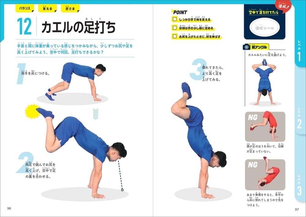 【メリット1】ジャンプや片足立ちなど簡単な動きから楽しめる、子供に自信がつく!読みやすいオールカラー、ふりがなつき。