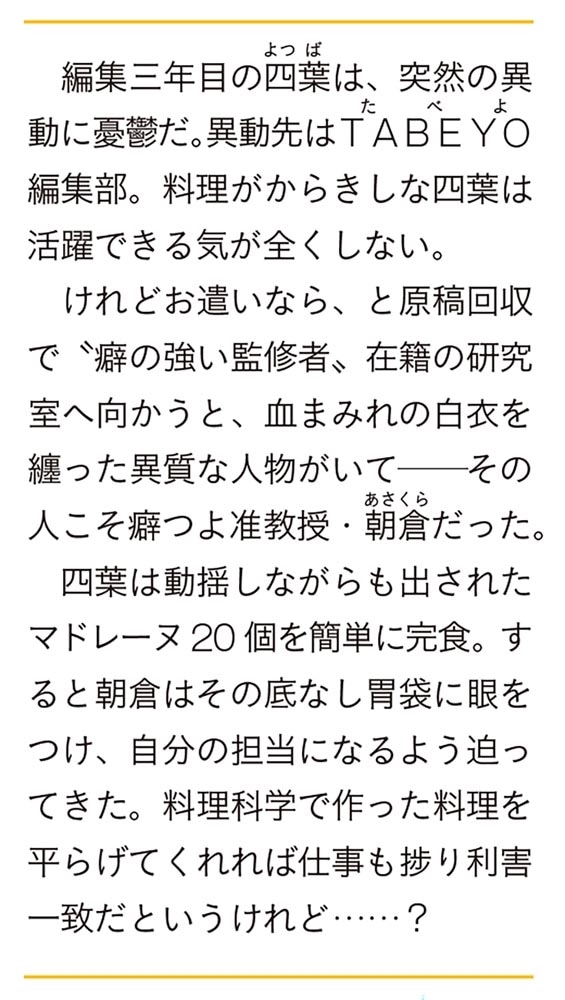 編集三年目の四葉は、突然の異動に憂鬱だ。異動先はTABEYO編集部。料理がからきしな四葉は活躍できる気が全くしない。