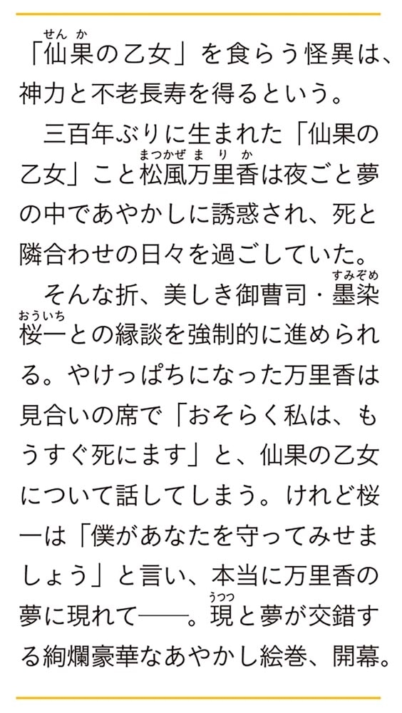 三百年ぶりに生まれた「仙果の乙女」こと松風万里香は夜ごと夢の中であやかしに誘惑され、死と隣合わせの日々を過ごしていた。