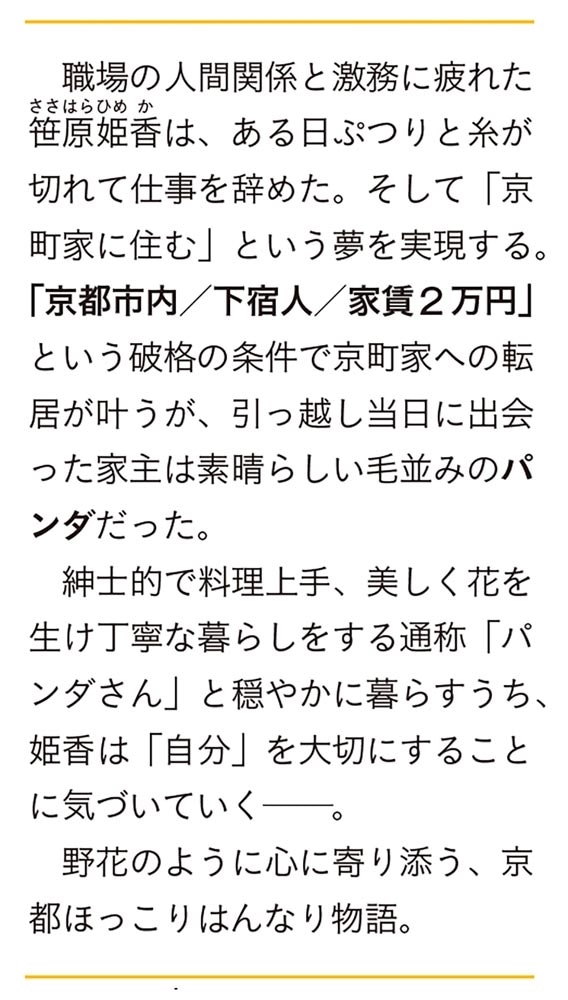 という破格の条件で京町家への転居が叶うが、引っ越し当日に出会った同居の管理人は素晴らしい毛並みのパンダだった。