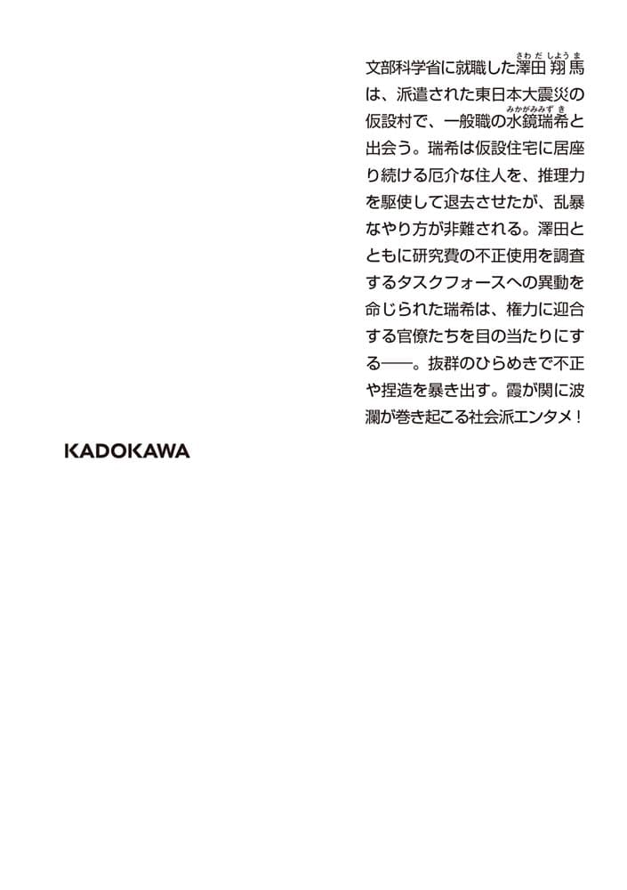 文部科学省に就職した澤田翔馬は、派遣された東日本大震災の仮設村で、一般職の水鏡瑞希と出会う。瑞希は仮設住宅に居座り続ける厄介な住人を、推理力を駆使して退去させたが、乱暴なやり方が非難される。澤田とともに研究費の不正使用を調査するタスクフォースへの異動を命じられた瑞希は、権力に迎合する官僚たちを目の当たりにする――。抜群のひらめきで不正や捏造を暴き出す。霞が関に波瀾が巻き起こる社会派エンタメ!