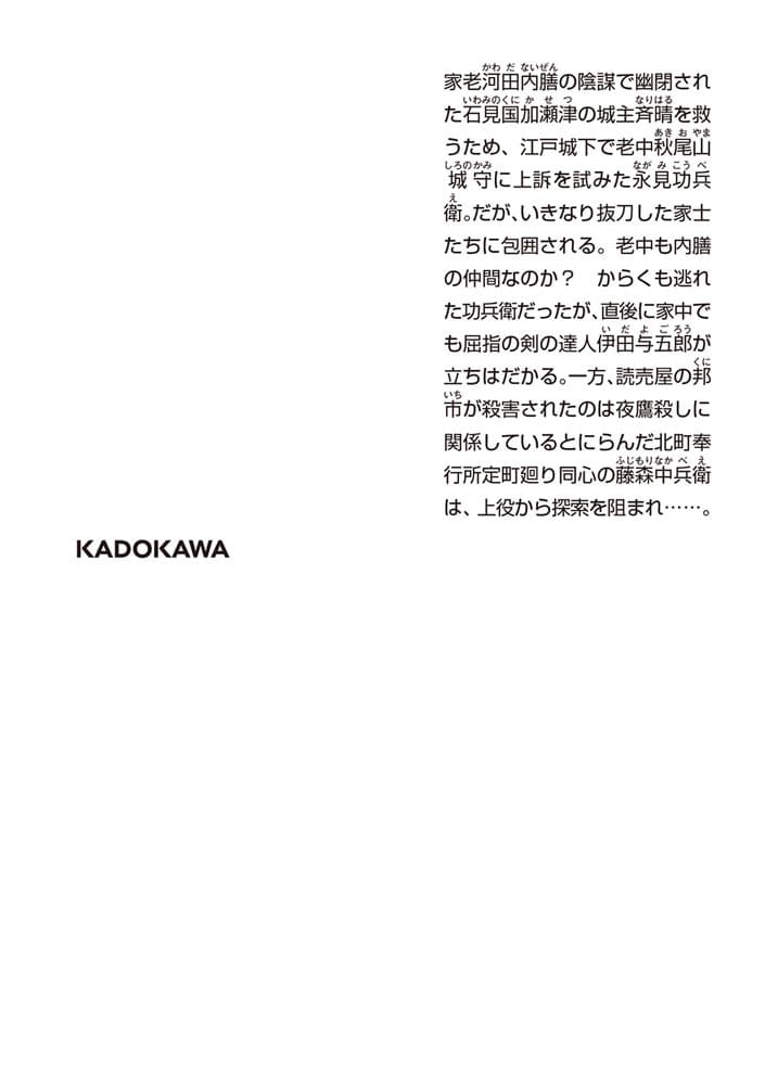 家老河田内膳の陰謀で幽閉された石見国加瀬津藩の城主斉晴を救うため、江戸城下で老中秋尾山城守に上訴を試みた永見功兵衛。だが、いきなり抜刀した家士たちに取り囲まれる。老中も陰謀に加担しているのか? からくも逃れた功兵衛だったが、直後に藩でも屈指の剣の達人伊田与五郎が立ちはだかる。一方、読売の邦市が殺害されたのは夜鷹殺しの裏にあると睨んだ北町奉行定廻り同心の藤森中兵衛は、上役から探索を阻まれ……。