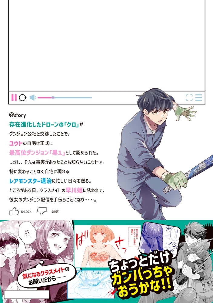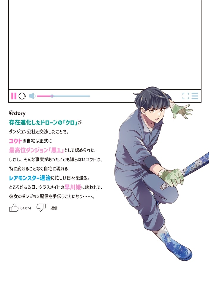 存在進化したドローンの「クロ」がダンジョン公社と交渉したことで、ユウトの自宅は正式に最高位ダンジョン「黒1」として認められた。しかし、そんな事実があったことも知らないユウトは、特に変わることなく自宅に現れるレアモンスター退治に忙しい日々を送る。ところがある日、クラスメイトの早川姫に誘われて、彼女のダンジョン配信を手伝うことになり……。ダンジョン配信を通じて、ユウトの日常と非日常が交錯する!