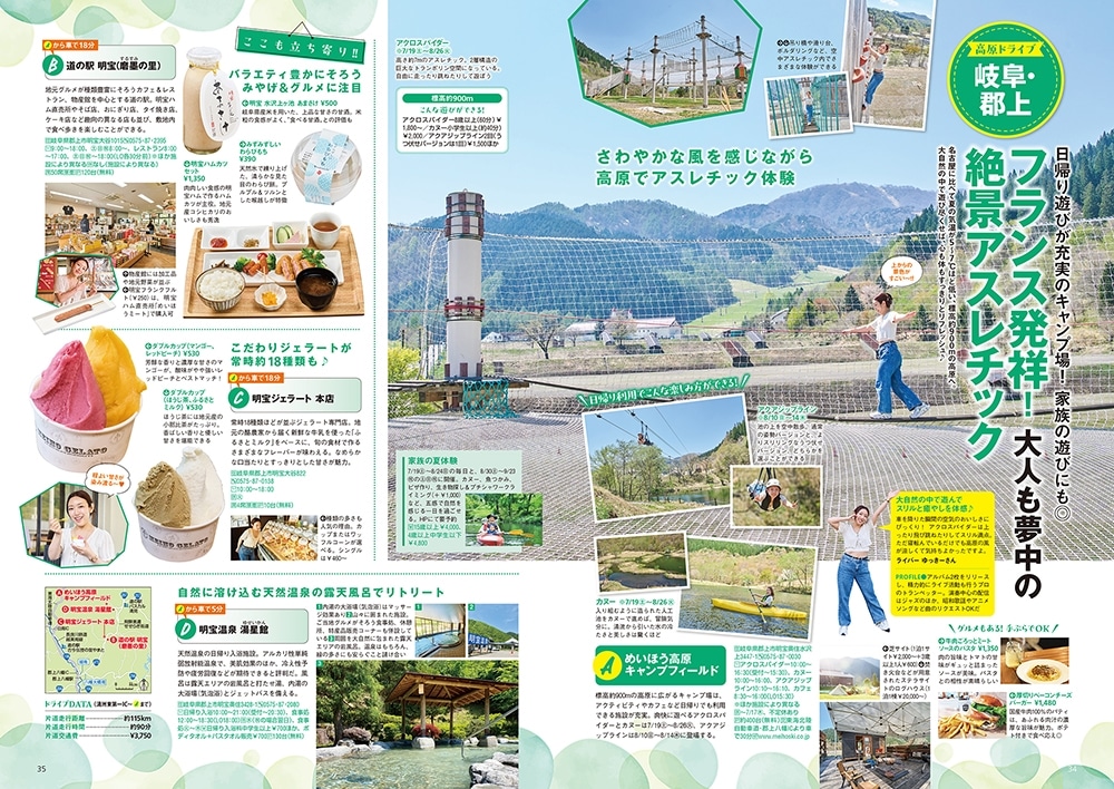 第1特集は「ひんやり夏遊び」。ほぼすべてのスポットが予約いらず、名古屋市内から日帰りで行けるドライブコースを提案。滝や渓谷&渓流、高原など、近場の大自然で涼体験しよう。ライブ配信アプリ「Pococha」の人気ライバーがモデルで登場し、水遊びをレポート!近隣の名物グルメや温泉、お土産など、ドライブの立ち寄りスポットが満載なので、一日中楽しめるコースが満載です。