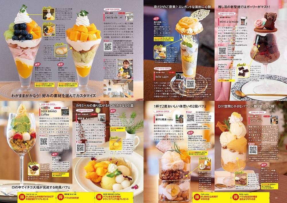 第2特集は、「最新パフェ&かき氷」。「リッチパフェ」「アートパフェ」「間借り氷」「ほろ酔い氷」など、最新トレンドのパフェとかき氷をたっぷり紹介。本誌だけのクーポン付きなので要チェック!