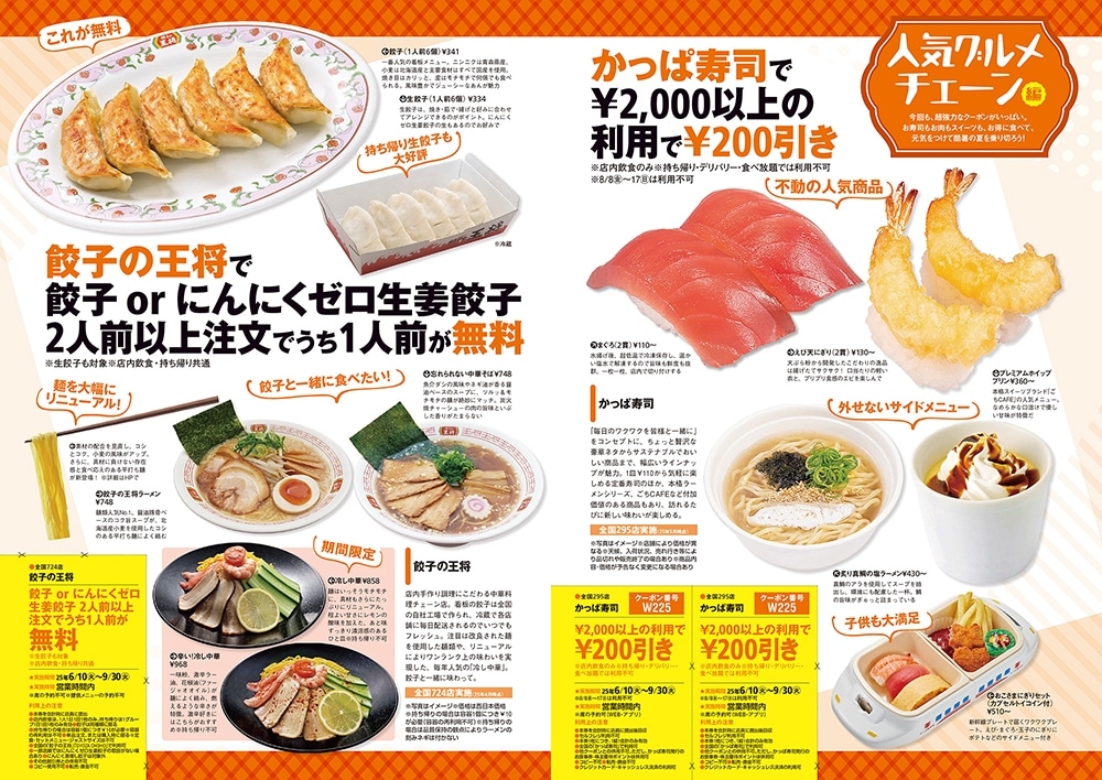 お得企画も目白押し!「かっぱ寿司」「餃子の王将」「ココス」「しゃぶ葉」「SUBWAY」など人気チェーン店や、カレーなど人気の夏グルメ&定番グルメがお得に食べられるほか、スーパー銭湯がお得に使えるクーポンが満載です。