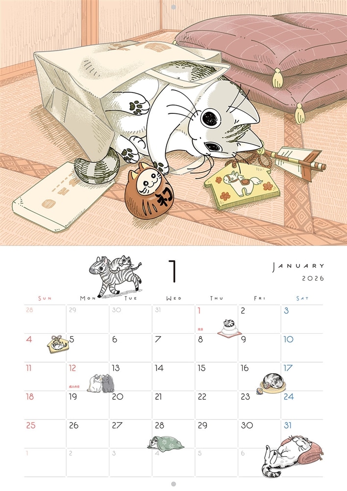 大人気コミック『夜は猫といっしょ』の世界観が楽しめる2026年1月はじまりの月めくりカレンダー。