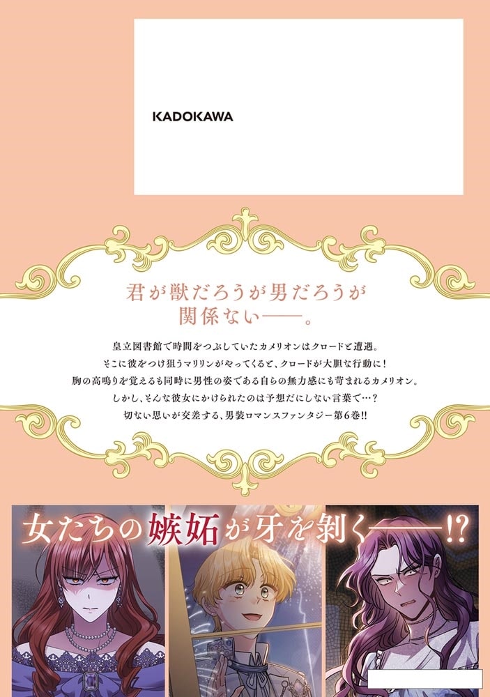 君が獣だろうが男だろうが関係ない――。皇立図書館で時間をつぶしていたカメリオンはクロードと遭遇。そこに彼をつけ狙うマリリンがやってくると、クロードが大胆な行動に!胸の高鳴りを覚えるも同時に男性の姿である自らの無力感にも苛まれるカメリオン。しかし、そんな彼女にかけられたのは予想だにしない言葉で…?切ない思いが交差する、男装ロマンスファンタジー第6巻!!