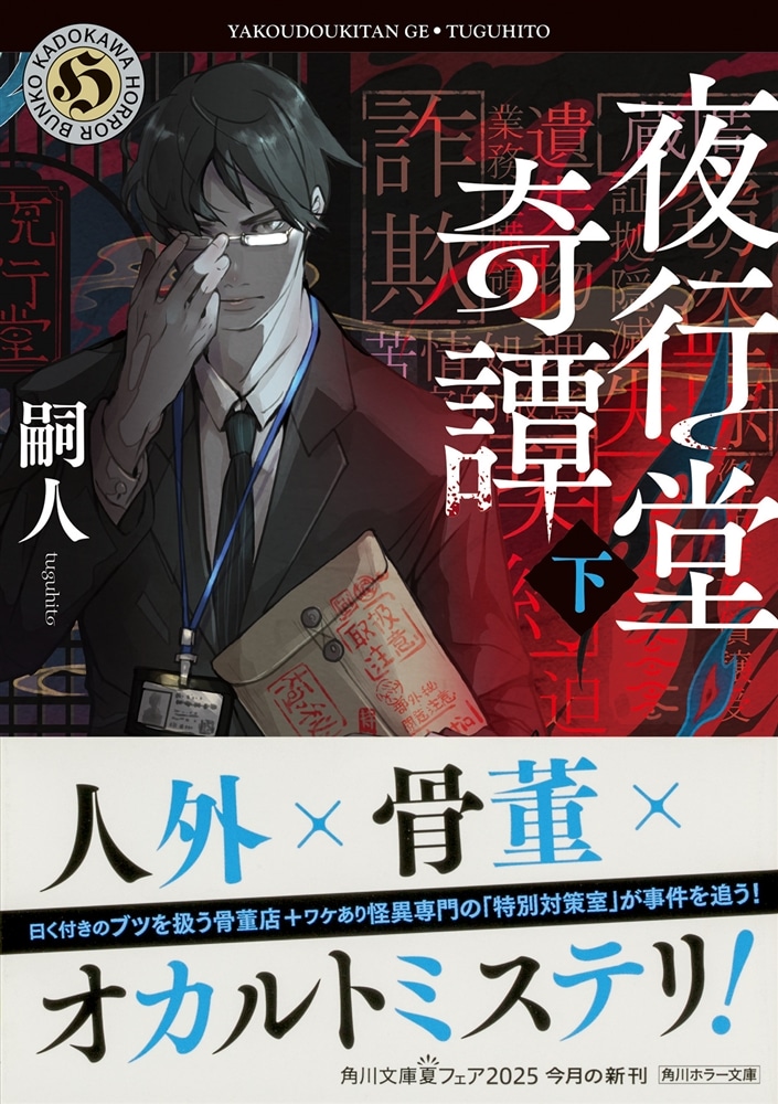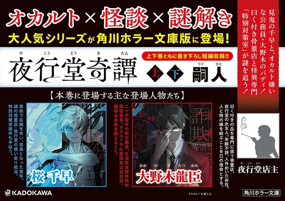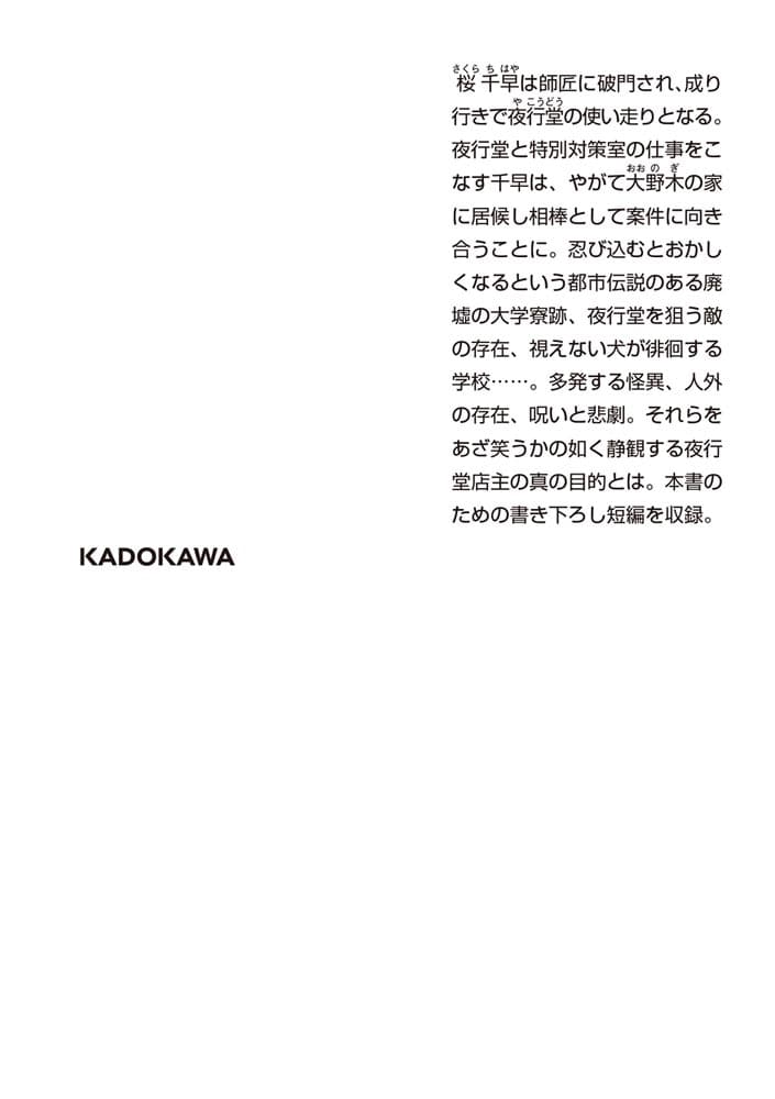 弟子入り先を破門されてしまった桜千早は夜行堂へと導かれ、成り行きで使い走りとして仕事を始める。夜行堂と特別対策室の依頼をこなす千早は、やがて業務の効率化の為に大野木の家に居候となることに。県庁の大野木に届いた依頼は、息子の変化に戸惑う母親からのものだった。訪問するとおかしくなるという都市伝説のある大学寮の廃墟。肝試しにいった息子は戻ってから様子がおかしくなり、部屋から一歩も出なくなってしまったという。一緒に行った友人から話を聞こうと、面談に訪れた青年はひどくおびえていた。大野木と千早は二人で話を聞くことに。多発する怪異には、人の情念や想いが、人ならざるものと混じっている。それらが引き起こす、数々の呪いと悲劇。それら怪異をあざ笑うかの如く静観する夜行堂店主の真の目的とは……。文庫化にあたり、上下巻それぞれに短編を書き下ろし収録。