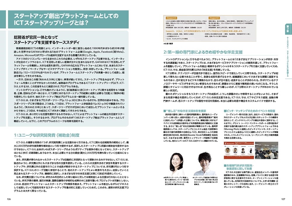 スポーツリーグの取り組みを見てわかるように、次世代のプラットフォーマーを目指すには、地域との連携、スタートアップの新しい技術やAIとの調和が不可欠である。そこで、プラットフォームを発展させている自治体や、新たな技術を創出する企業のケーススタディを多数掲載。スタートアップの創出を支える「ICTスタートアップリーグ」も取り上げている。