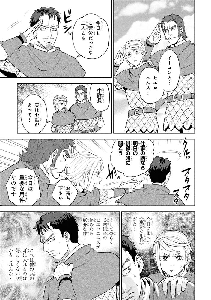 古都の衛兵隊中隊長・ベルトホルトは部下のイーゴンとヒエロニムスにとある相談を持ちかけられる。衛兵隊の将来を担う二人が揃っての相談に警戒するベルトホルトだが、その内容は――。