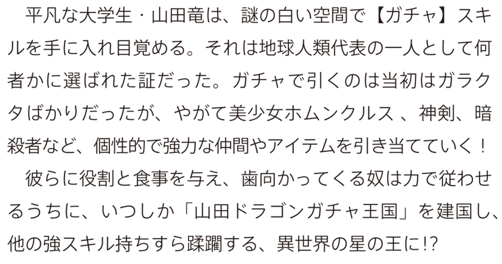 平凡な大学生・山田竜は、謎の白い空間で【ガチャ】スキルを手に入れ目覚める。それは地球人類代表の一人として何者かに選ばれた証だった。ガチャで引くのは当初はガラクタばかりだったが、やがて美少女ホムンクルス 、神剣、暗殺者など、個性的で強力な仲間やアイテムを引き当てていく!