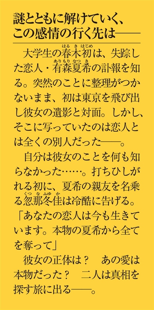 大学生の春木初は、失踪した恋人・有森夏希の訃報を知る。突然のことに整理がつかないまま、初は東京を飛び出し彼女の遺影と対面。しかし、そこに写っていたのは恋人とは全くの別人だった――。