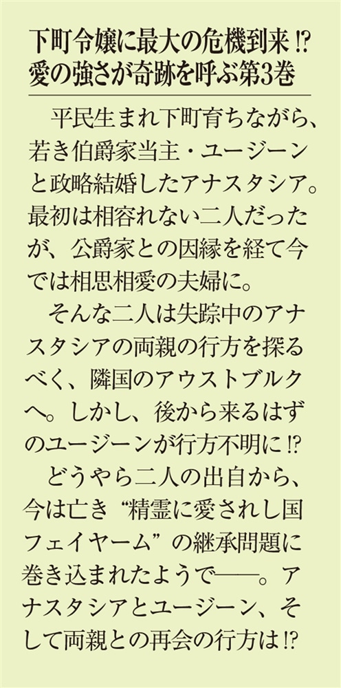 そんな二人は、失踪中のアナスタシアの両親の行方を探るべく、隣国のアウストブルクへ。しかし、後から来るはずのユージーンが行方不明に!?