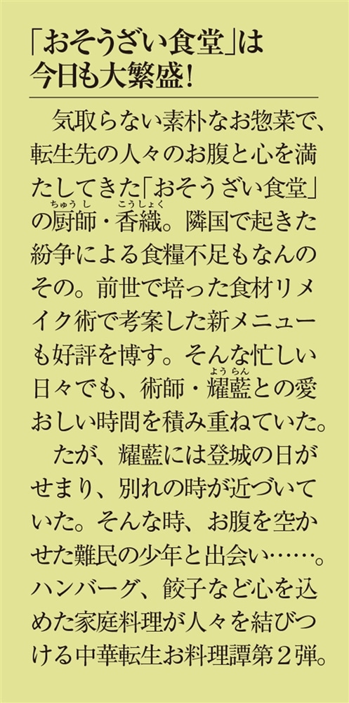 気取らない素朴なお惣菜で、転生先の人々のお腹と心を満たしてきた「おそうざい食堂」の厨師・香織。隣国で起きた 紛争による食糧不足もなんのその。前世で培った食材リメイク術で考案した新メニューも好評を博す。そんな忙しい日々でも、術師・耀藍との愛おしい時間を積み重ねていた。
