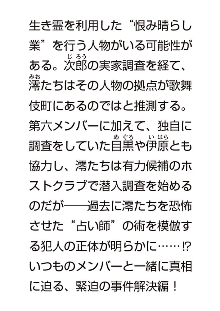 第六メンバーに加え、独自に調査をしていた目黒や伊原とも協力し、澪は有力候補のホストクラブへ潜入調査を始めるが――