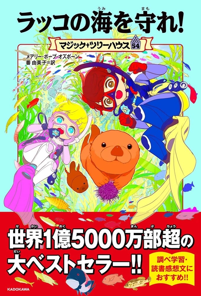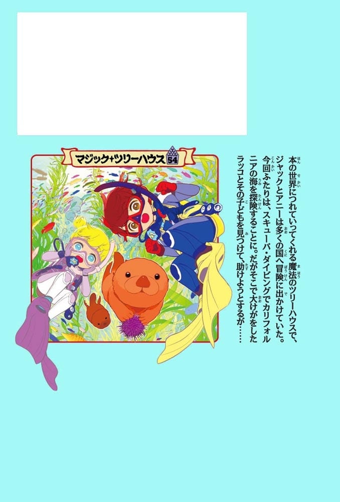 【54巻あらすじ】ジャックとアニーは、魔法のツリーハウスにのって、カリフォルニア州モントレーを訪れる。モントレー湾には海藻ジャイアント・ケルプが森のように育ち、そこにたくさんの海の生き物が生息する豊かな海だった。なかでもラッコは、この海域の生態系の頂点に位置する大切な動物だったが、人間による乱獲で数が激減。それによりウニが大量発生して海藻を食いあらし、海域の生態系が深刻な危機にさらされていた。ジャックとアニーは、地元の漁師ボブの船でウニ漁を手伝っていたが、ダイビング中に大けがを負ったラッコとその赤ちゃんを見つけ、保護しようとする。しかしボブは、ぜったいにラッコを助けてはいけないと言う。このままではラッコの親子の命があぶない! はたしてふたりは――!?
