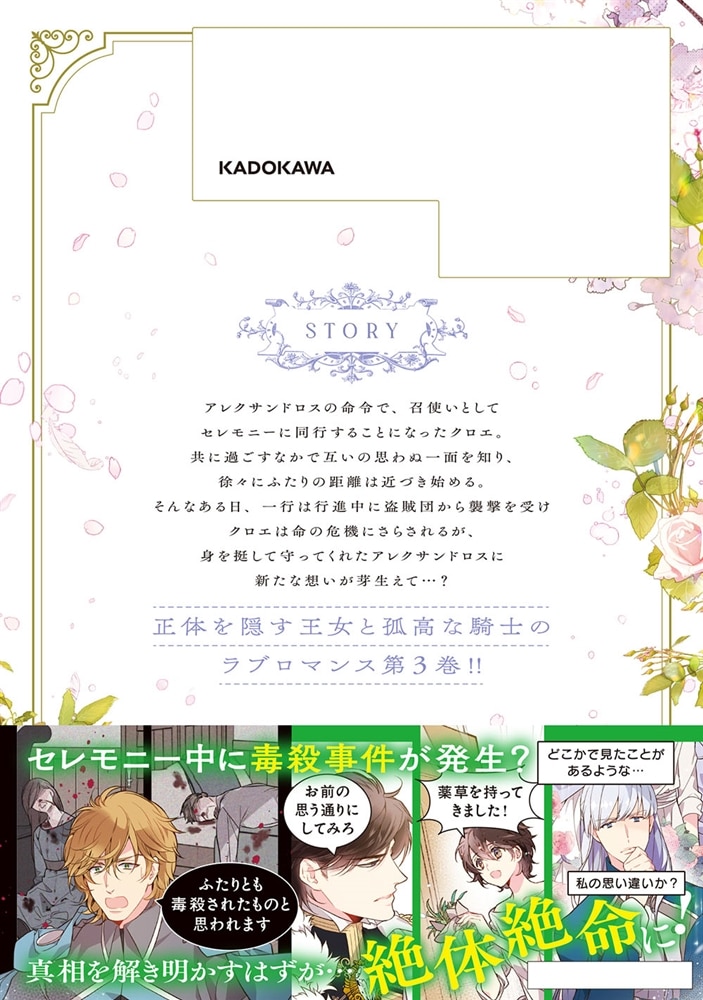 アレクサンドロスの命令で、召使いとしてセレモニーに同行することになったクロエ。共に過ごすなかで互いの思わぬ一面を知り、徐々にふたりの距離は近づき始める。そんなある日、一行は行進中に盗賊団から襲撃を受けクロエは命の危機にさらされるが、身を挺して守ってくれたアレクサンドロスに新たな想いが芽生えて…?正体を隠す王女と孤高な騎士のラブロマンス第3巻!