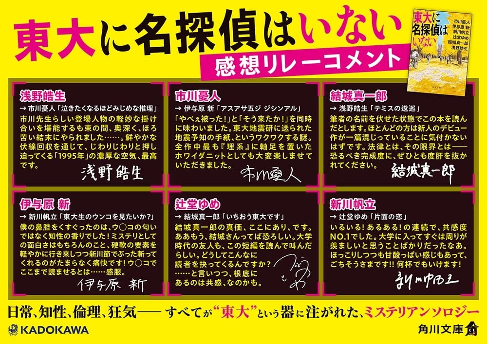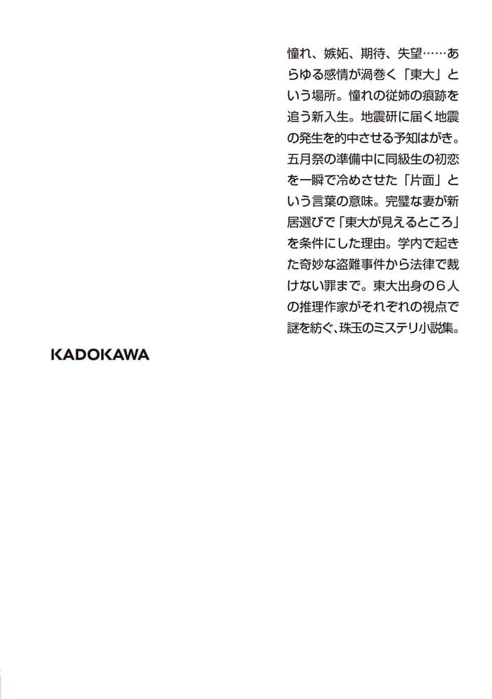 東大出身の6人の推理作家たちがそれぞれの視点で謎を紡ぐ、濃厚で多彩なミステリアンソロジー。