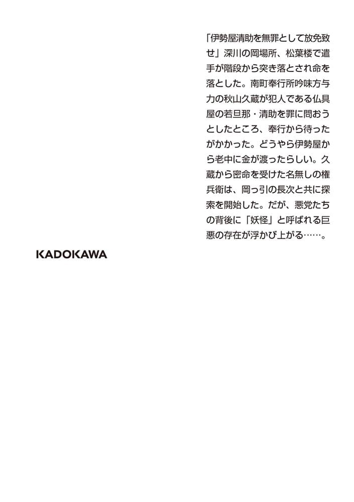 「伊勢屋清助を無罪として放免いたせ」深川の岡場所松葉楼で遣手が階段から突き落とされ命を落とした。南町奉行所吟味方与力の秋山久蔵が犯人である仏具屋の若旦那・清助を罪に問おうとしたところ、御奉行から待ったがかかった。どうやら伊勢屋から老中に金が渡ったらしい。久蔵から密命を受けた名無しの権兵衛は、岡っ引きの長次と共に探索を開始した。だが、悪党たちの裏に「妖怪」と呼ばれる巨悪の存在が浮かび上がる……。