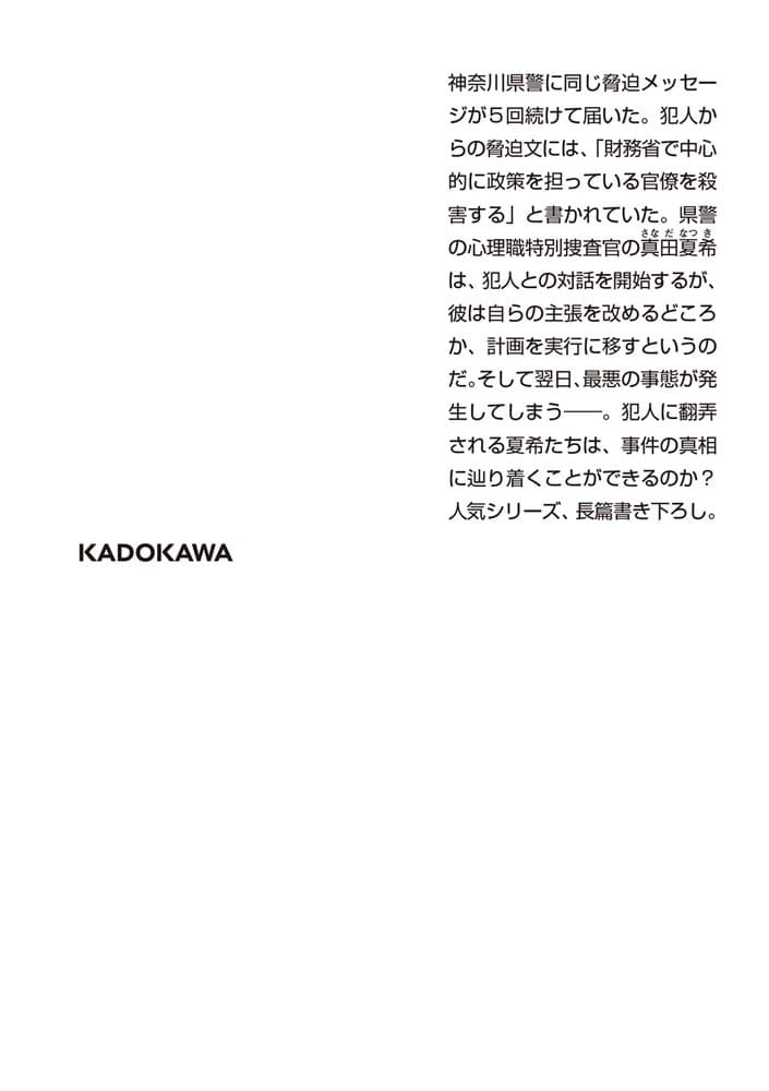 神奈川県警に同じ脅迫メッセージが5回続けて届いた。犯人からの脅迫文には、「財務省で中心的に政策を担っている官僚を殺害する」と書かれていた。県警の心理職特別捜査官の真田夏希は、犯人との対話を開始するが、彼は自らの主張を改めるどころか、計画を実行に移すというのだ。そして翌日、最悪の事態が発生してしまう――。犯人に翻弄される夏希たちは、事件の真相に辿り着くことができるのか?