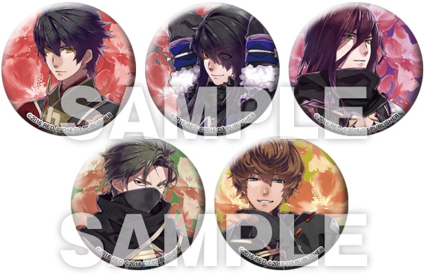 月下丸、黒雪、百地 蝶治郎、服部 半蔵、石川 五右衛門の5人を缶バッジにした5個セット!