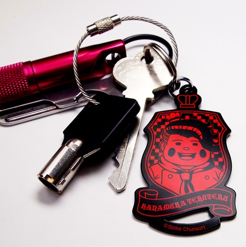 『花村輝々』がプリントされた、エンブレム形状のステンレス製キーホルダー。