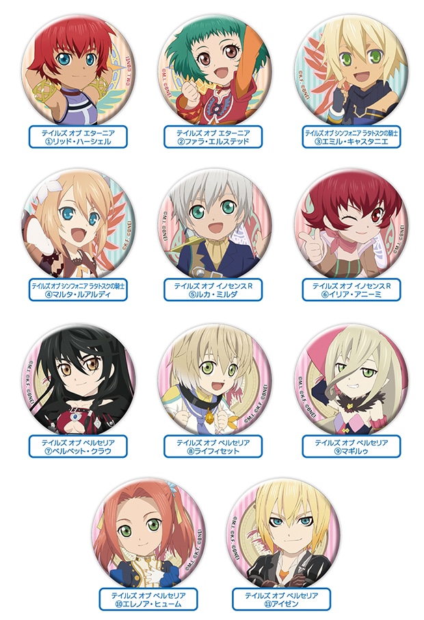 アニメ制作会社ufotableによって描かれた、『テイルズ オブ』シリーズの人気キャラクターのかわいいデフォルメイラストがデザインされたトレーディング缶バッジです。