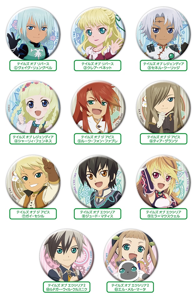 アニメ制作会社ufotableによって描かれた、『テイルズ オブ』シリーズの人気キャラクターのかわいいデフォルメイラストがデザインされたトレーディング缶バッジです。
