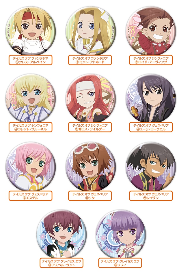 アニメ制作会社ufotableによって描かれた、『テイルズ オブ』シリーズの人気キャラクターのかわいいデフォルメイラストがデザインされたトレーディング缶バッジです。