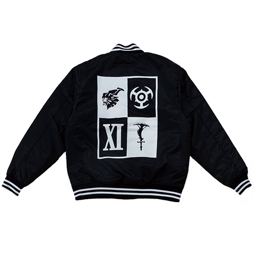 「闇の王」を象ったワッペンを左胸に配し、さらに「闇の王」プリントを背中に大きく配した、MA-1スタイルのジャケットです。首元と袖、裾のリブは、黒とホワイトのストライプとなっております。