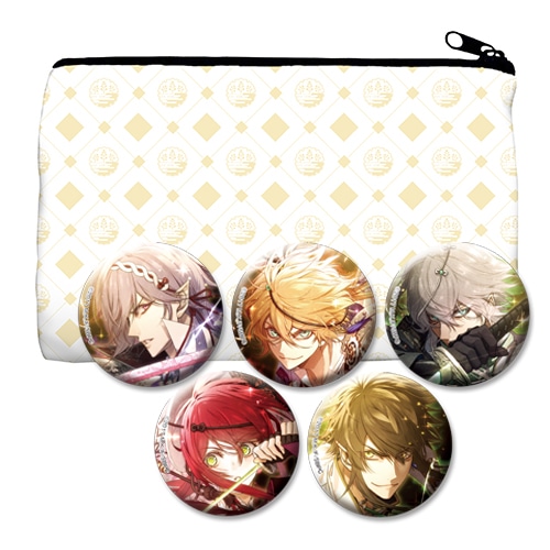 豊臣軍の家紋をあしらったマルチポーチと、豊臣軍武将たちの“覚醒”缶バッジ5個のセット。