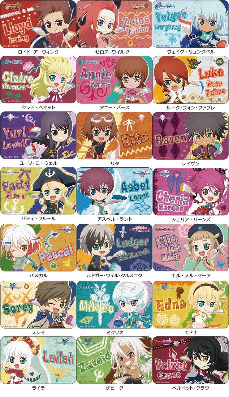 01 ロイド・アーヴィング/02 ゼロス・ワイルダー/03 ヴェイグ・リュングベル/04 クレア・ベネット/05 アニー・バース/06 ルーク・フォン・ファブレ/07 ユーリ・ローウェル/08 リタ/09 レイヴン/10 パティ・フルール/11 アスベル・ラント/12 シェリア・バーンズ/13 パスカル/14 ルドガー・ウィル・クルスニク/15 エル・メル・マータ/16 スレイ/17 ミクリオ/18 エドナ/19 ライラ/20 ザビーダ/21 ベルベット・クラウ
