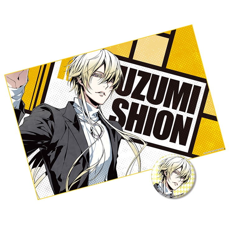 B's-LOG掲載描き下ろしイラストを使用した「黛 汐音」のマイクロファイバータオルと缶バッジのセットです。