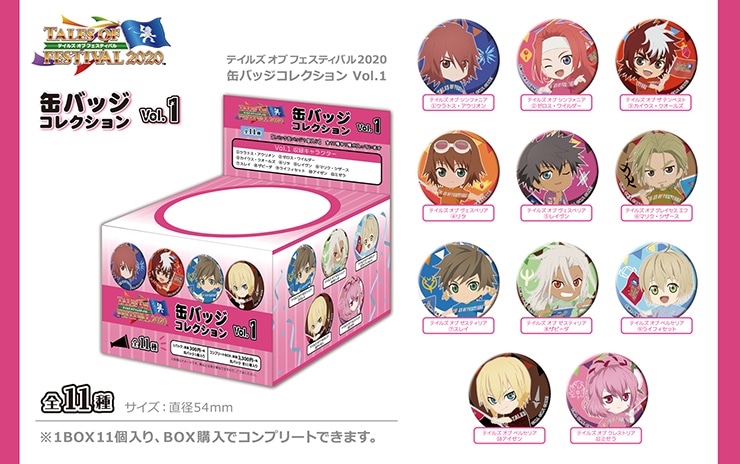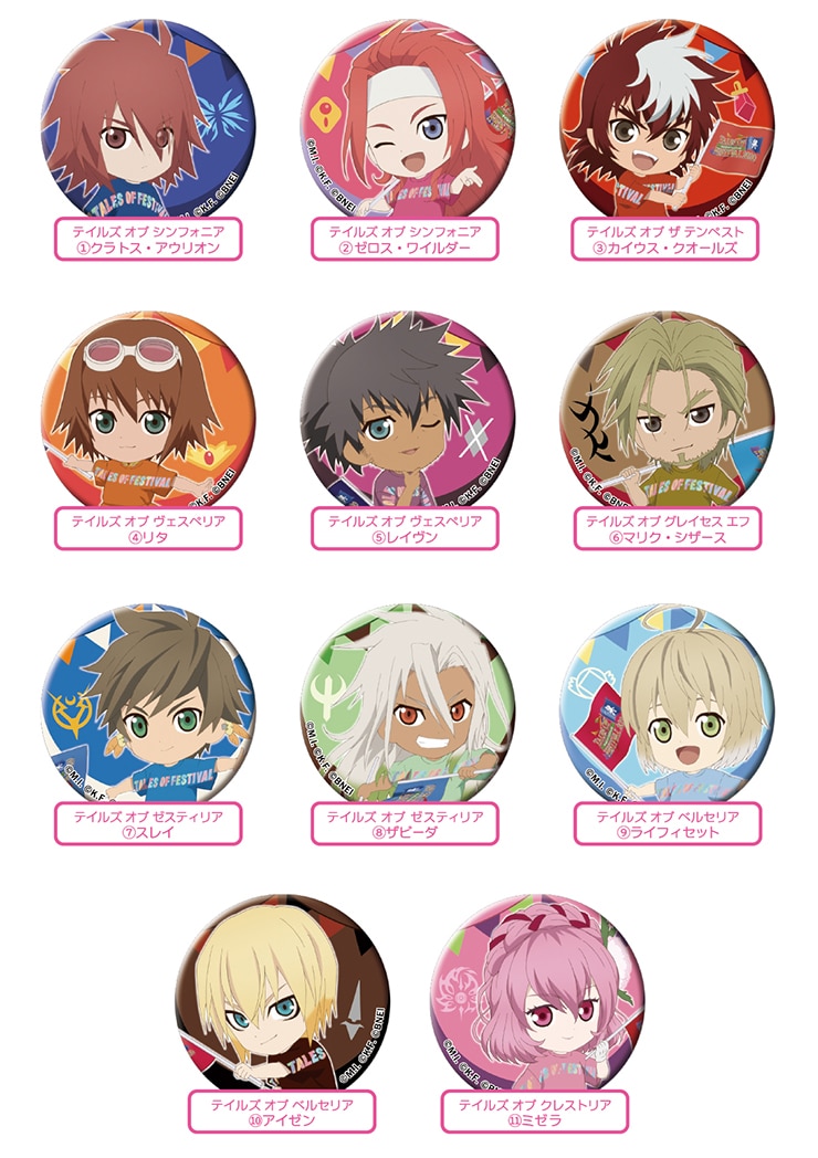 『テイルズ オブ』シリーズファンにはおなじみの、人気イベント『テイルズ オブ フェスティバル 2020』の2020年6月に出演を予定してしたキャラクターたちのかわいいデフォルメイラストがデザインされたトレーディング缶バッジです。