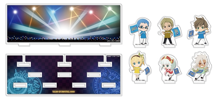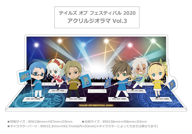 『テイルズ オブ』シリーズファンにはおなじみの、人気イベント『テイルズ オブ フェスティバル 2020』の2020年6月に出演を予定してしたキャラクターたちのかわいいデフォルメイラストがデザインされたアクリル製のスタンドフィギュアに、ステージをイメージした背景パーツをセットにしたアクリルジオラマです。