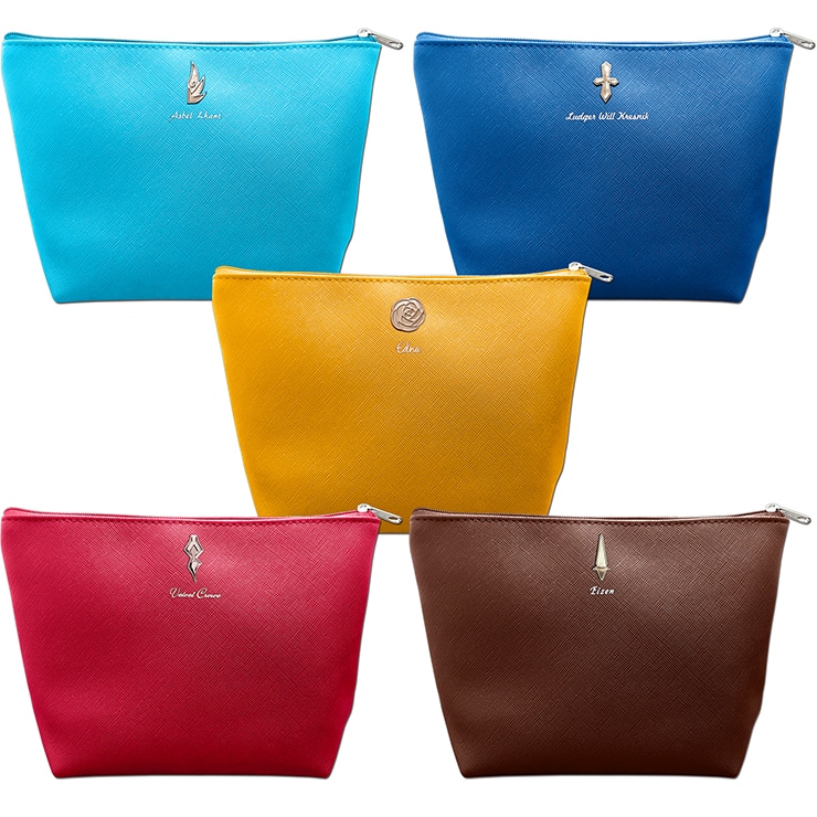 表側はイメージカラーを配色した合皮を使用し、柔らかい合成レザーで扱いやすいポーチに仕上がっています。各キャラクターの象徴的なマークをあしらった金属パーツもワンポイント。