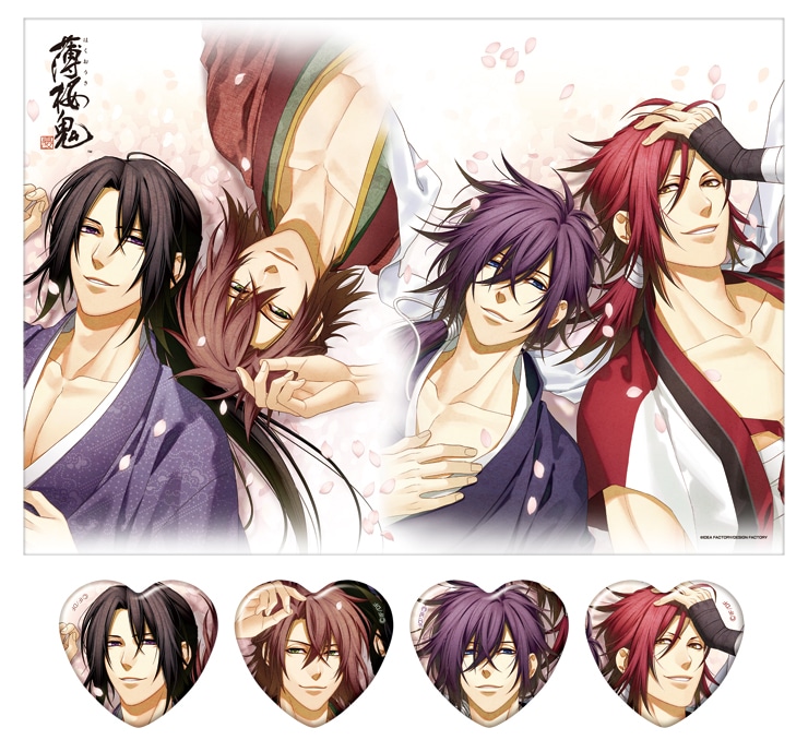 B's-LOG2019年12月号で描き下ろされた【土方歳三・沖田総司・斎藤一・原田左之助】のイラストを使用したA2サイズのファブリックポスターと、ハート型缶バッジ4種セットです。